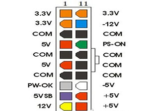 这些针脚通常位于ATX电源插头和ATX主板电源插座的双排24针连接器中。第一排为1至12针,第二排为13至24针。与20针插座相比,24针插座增加了+12V、+3.3V、+5V三个输出和一根地线。第1至10针、13至22针的排列及定义与20针插座相同。 ATX电源的特点是不采用传统的市电开关来控制电源是否工作,而是采用"+5VSB、PS-ON"的组合来实现电源的开启和关闭。只要控制"PS-ON"信号电平的变化,就能控制电源的开启和关闭。当"PS-ON"小于1V时开启电源,大于4.5伏时关闭电源。